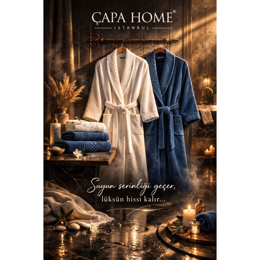 İlay Kadife Bornoz Seti -Indigo_Beyaz